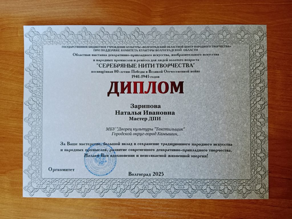 24 октября в городе Волгоград состоялся областной фестиваль народного творчества ветеранов войны, труда, Вооружённых Сил и правоохранительных органов “Рассветы золотой осени”, где приняли участие творческие коллективы и мастера декоративно-прикладного искусства Дворца Культуры “Текстильщик”.