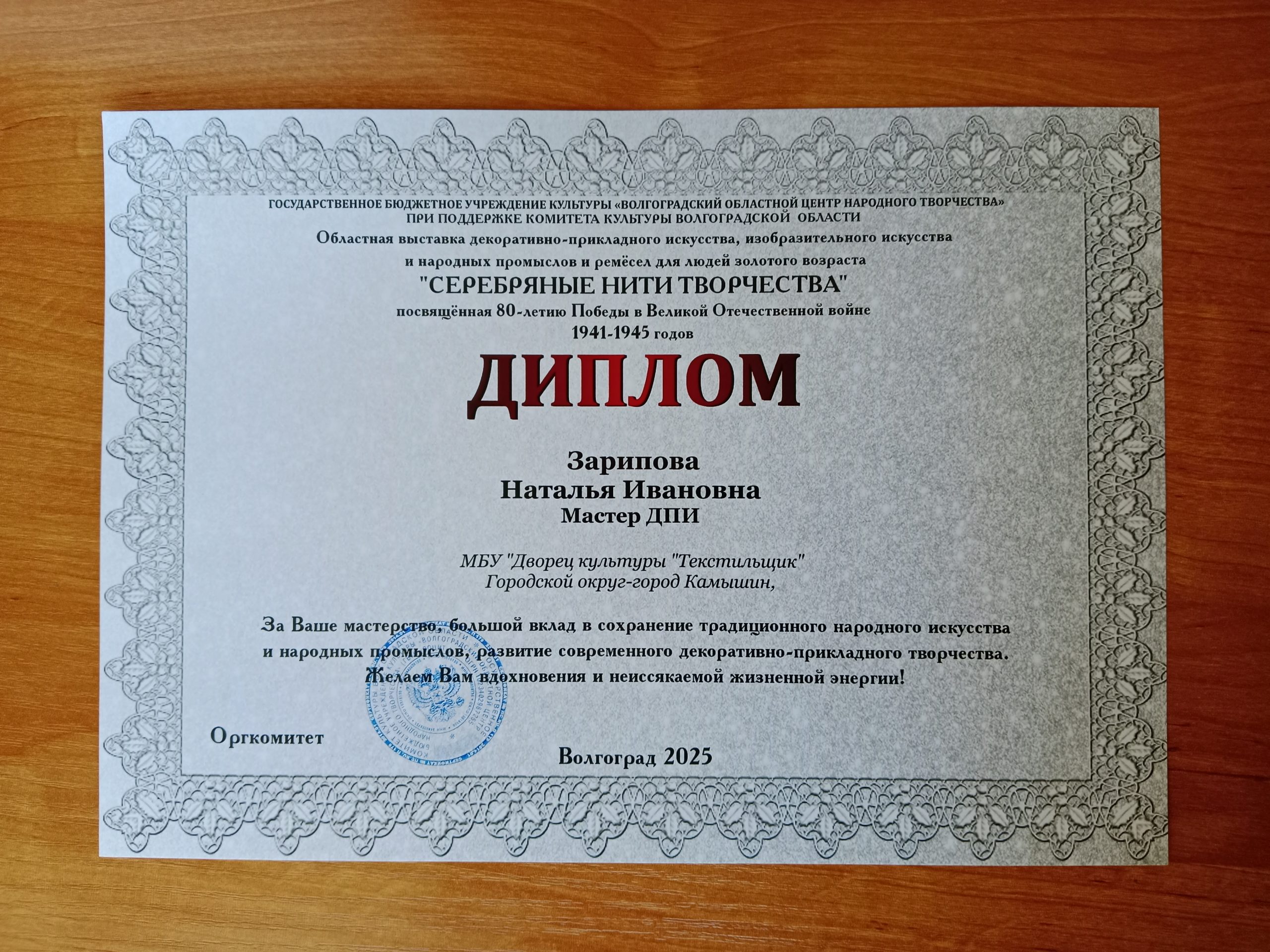 24 октября в городе Волгоград состоялся областной фестиваль народного творчества ветеранов войны, труда, Вооружённых Сил и правоохранительных органов “Рассветы золотой осени”, где приняли участие творческие коллективы и мастера декоративно-прикладного искусства Дворца Культуры “Текстильщик”.